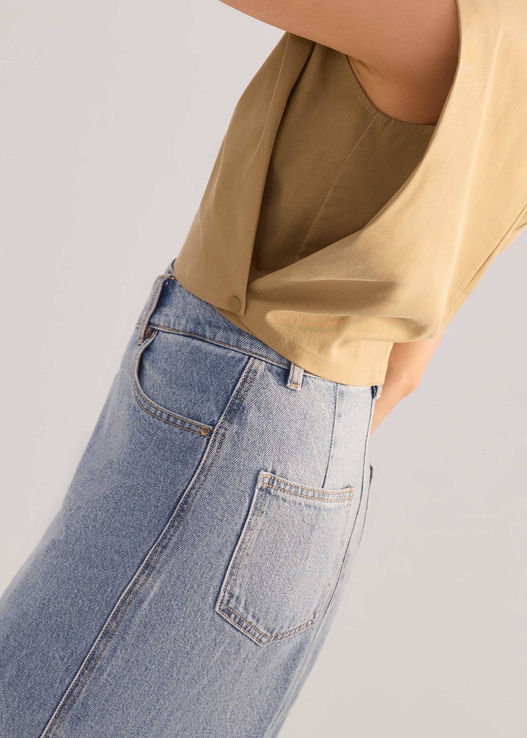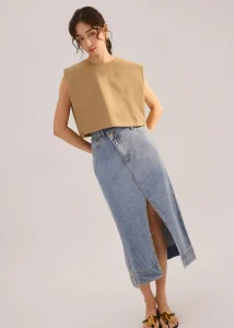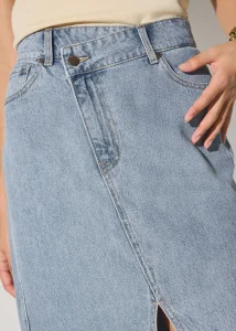 Be the first to review “Denim Asymmetric Waistband Front Slit Column Midaxi Skirt”