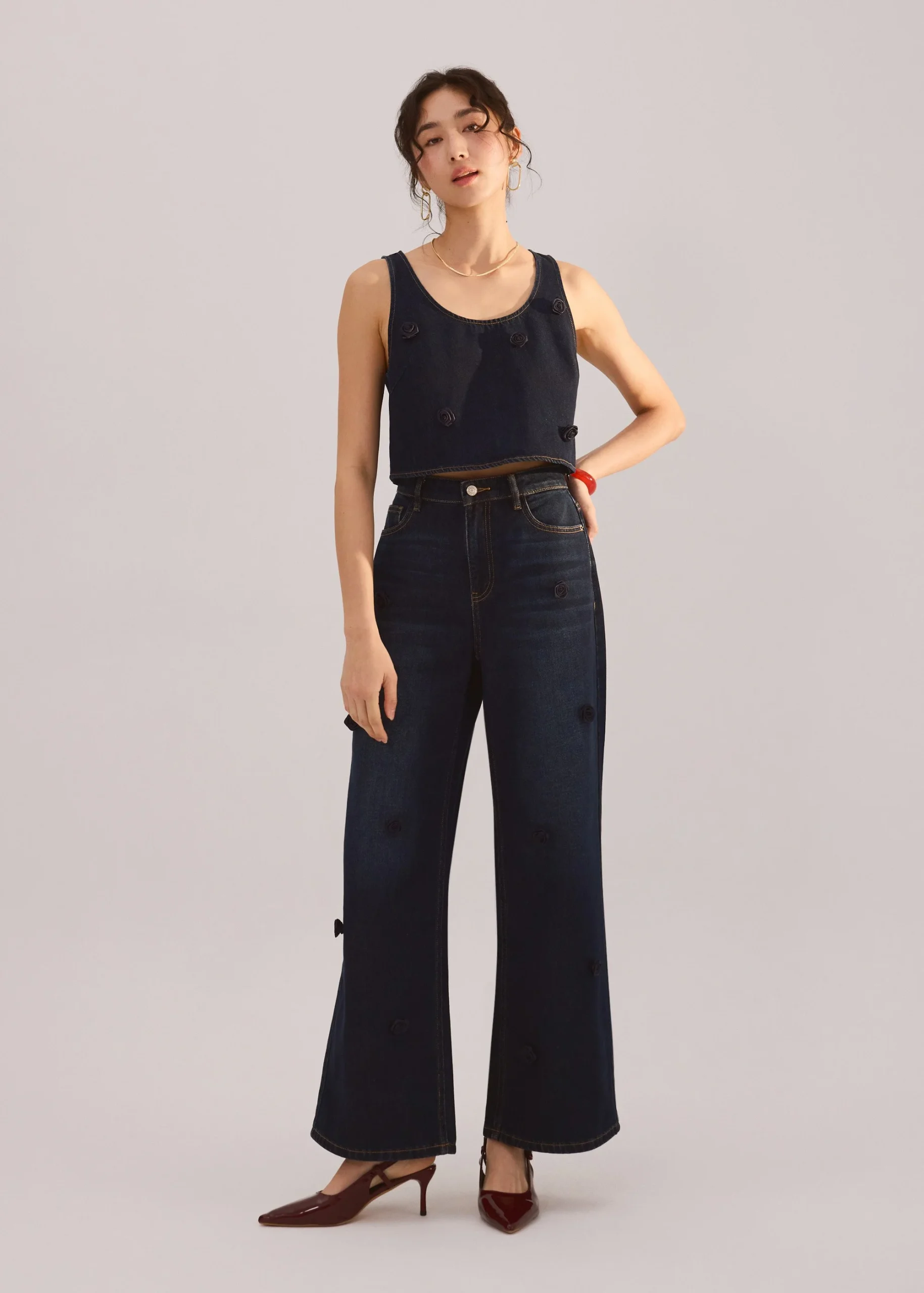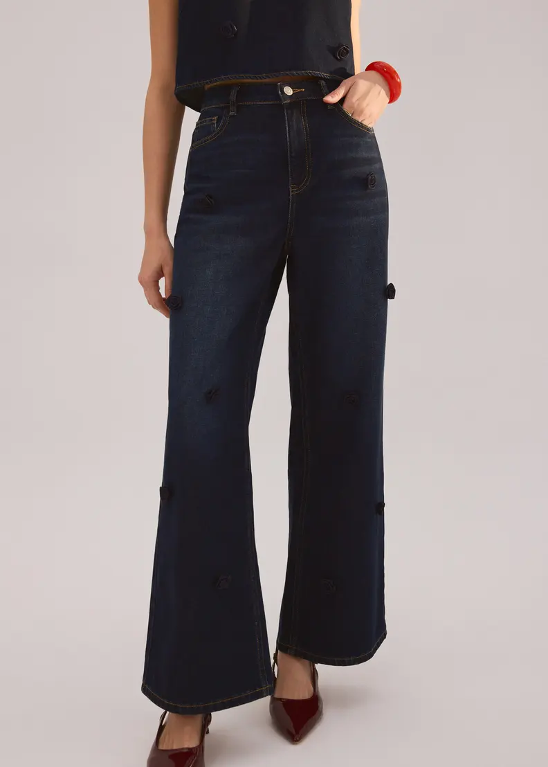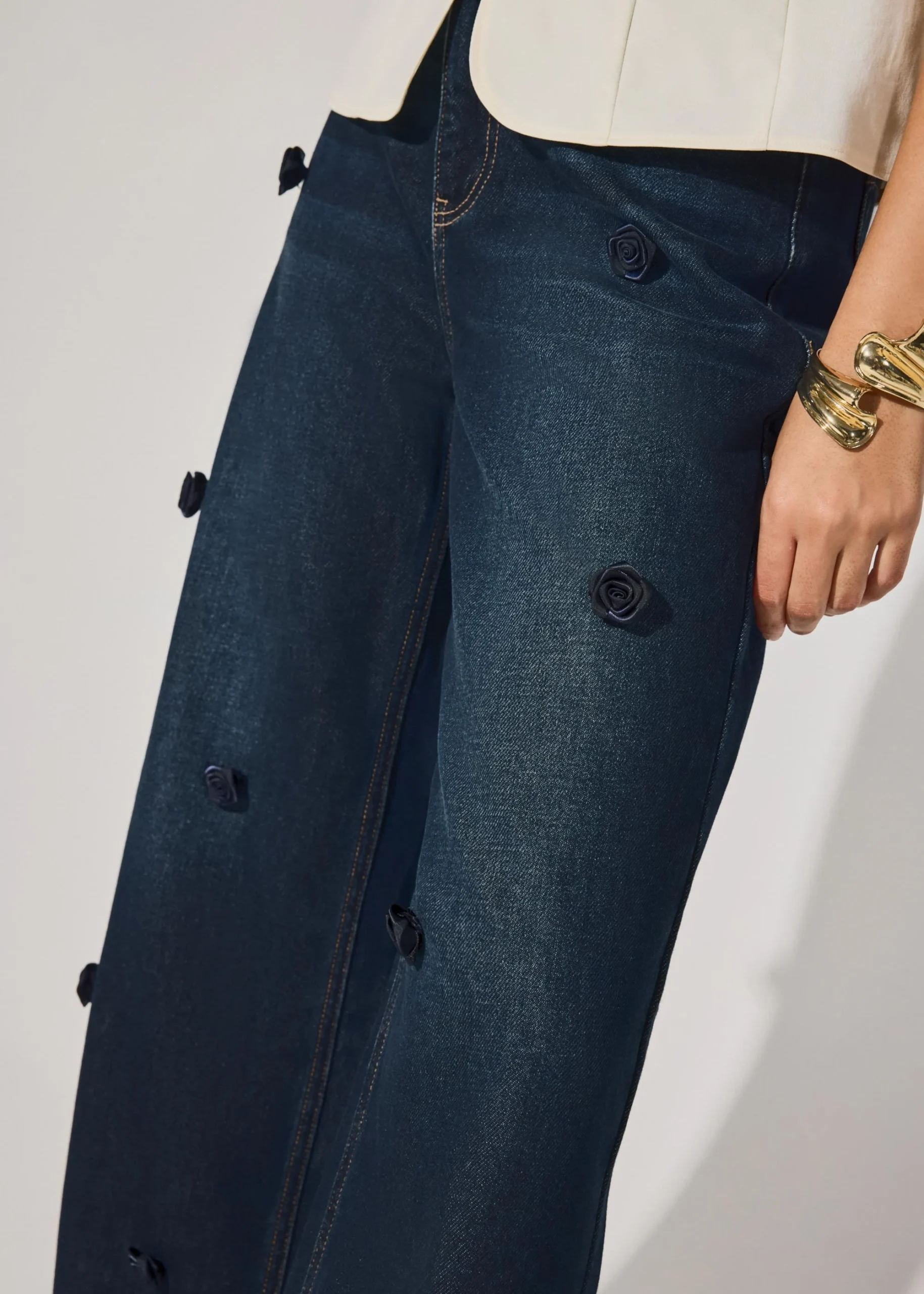 Some weekends call for denim with a little personality. Cut in a straight-leg, full-length silhouette, these jeans sit comfortably at a mid waist and wear easily from morning plans to whatever comes after. Finished with subtle rosette accents that add just enough charm, while the dark wash brings the drama.