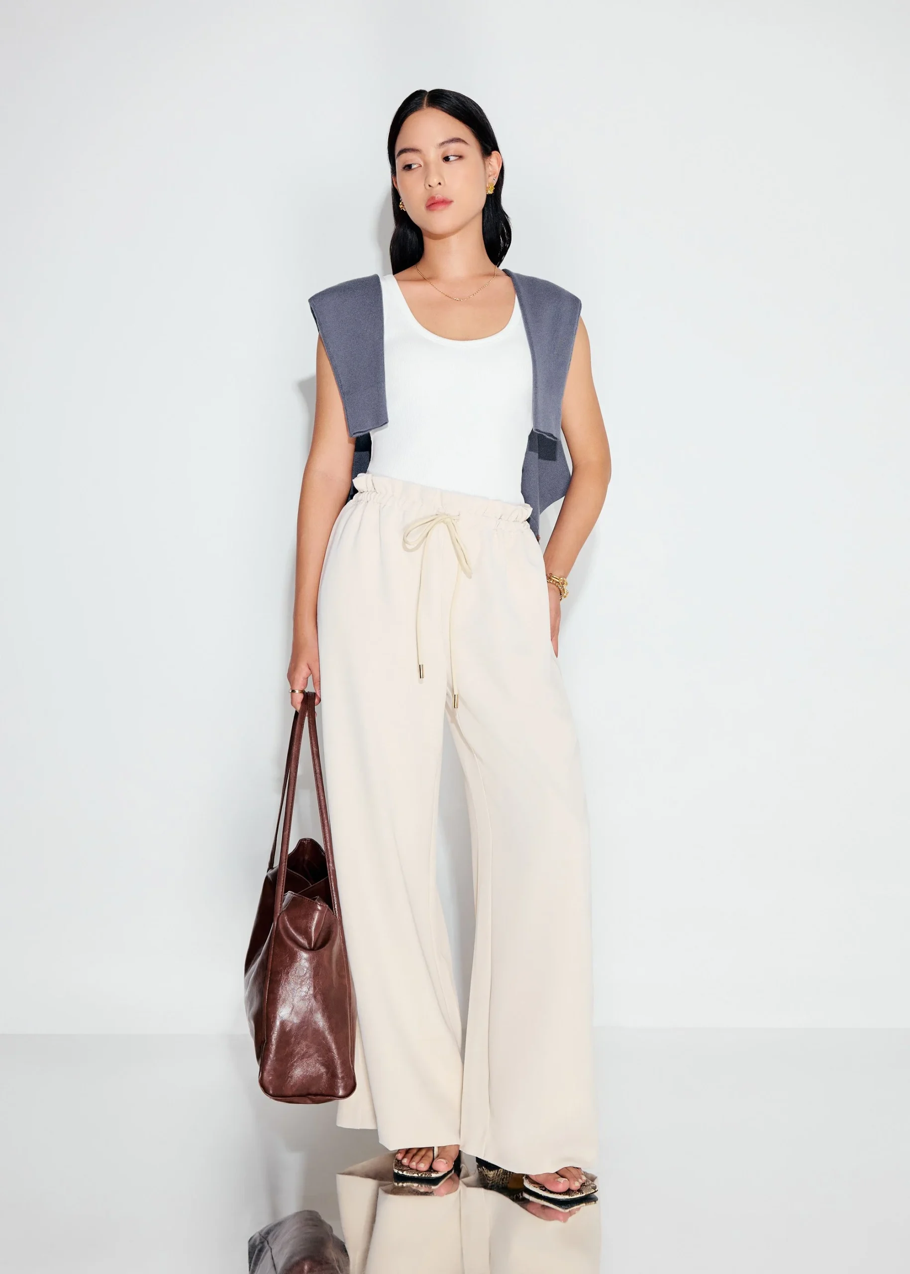Comfy enough for bare-minimum energy, cute enough to act like you tried. These full-length elastic pants are designed for real-life movement—think brunch plans, grocery runs, or airport days. The high waist is fully elasticated, and the drawstring lets you adjust the exact fit you want. Cut in a relaxed straight silhouette with functional side pockets for your emotional support essentials. Creases? Could never be her, even after sitting, packing, or sprinting through your day.