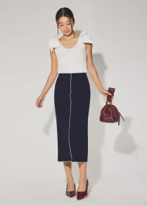 Easy days deserve easy outfits. This knit midi skirt skims the body in a clean column silhouette that still feels relaxed. Designed to sit at the mid waist and finished with delicate scallop edging along the hem and in front for just enough detail to keep things interesting.