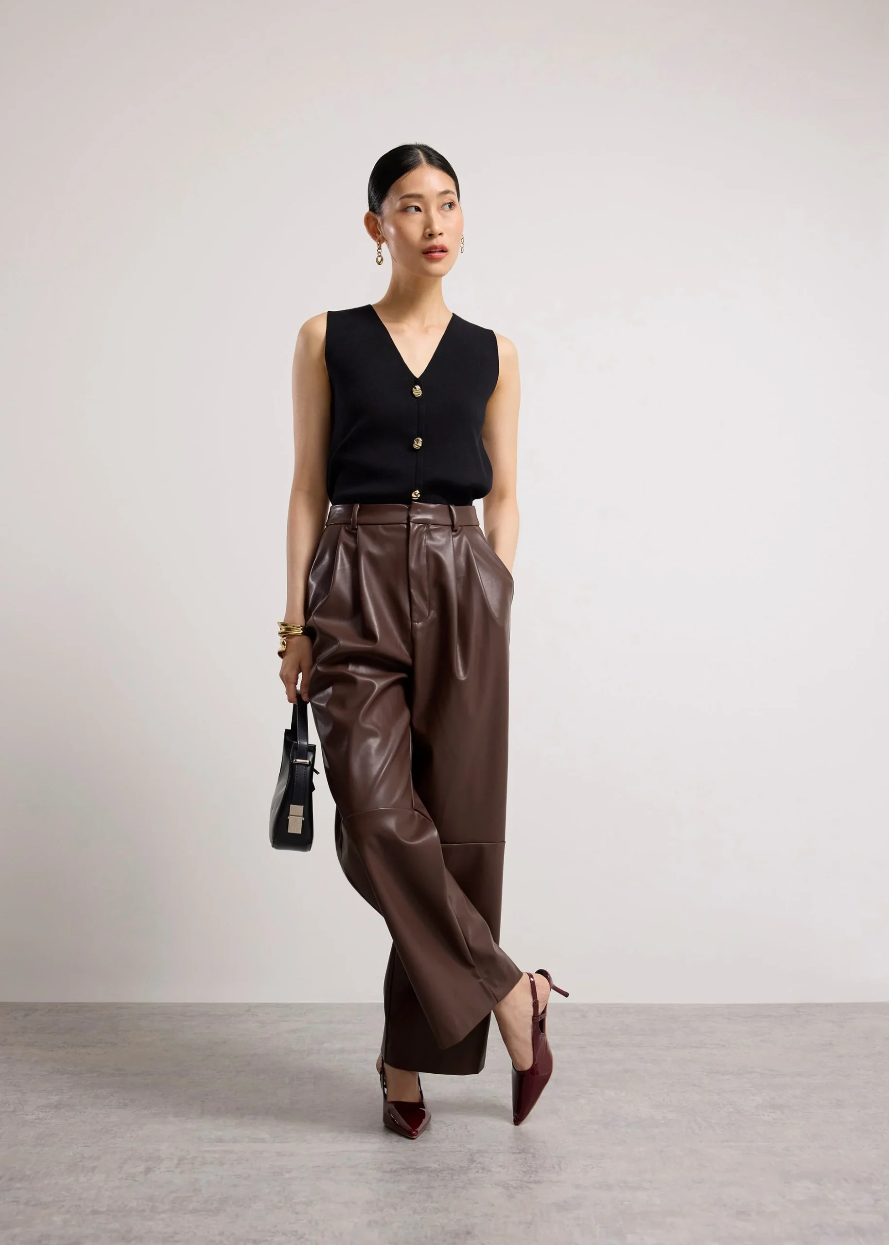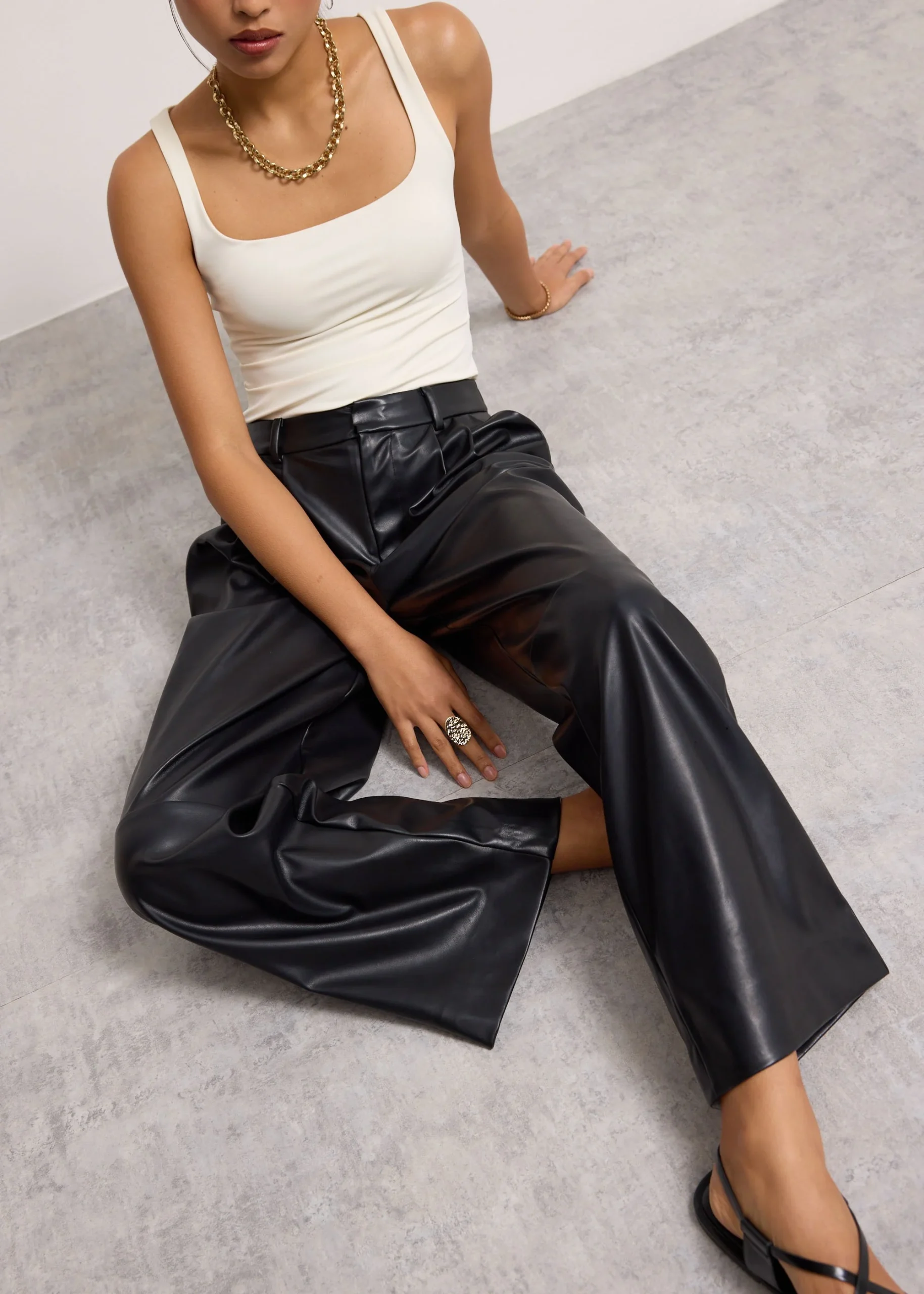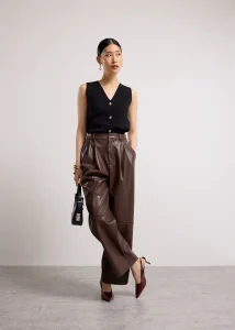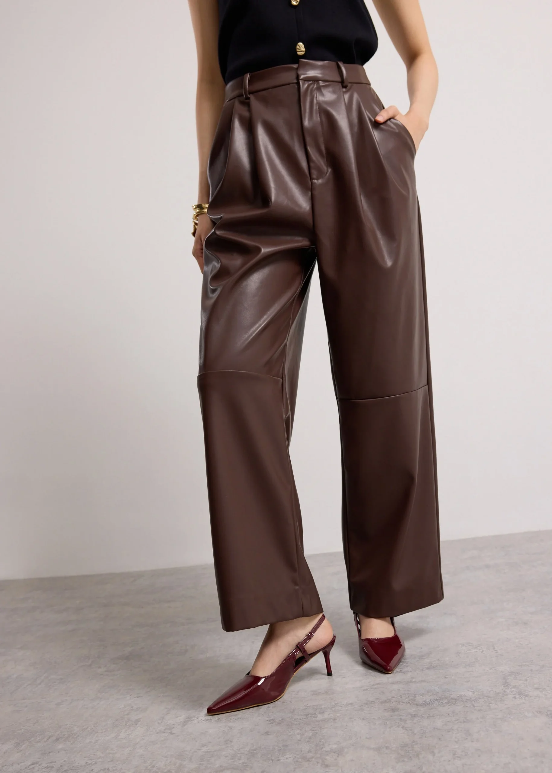 You’re known for your good taste and goal-getter energy. Command attention in these pleather straight-leg pants that are cut in a full-length silhouette that elongates the legs while keeping things polished. Designed with a mid-rise fit, functional side pockets, and a clean front fly, this pair balances structure and edge effortlessly. She’s perfect with blazers, fitted tops, or oversized knits—or TBH, anything you want.