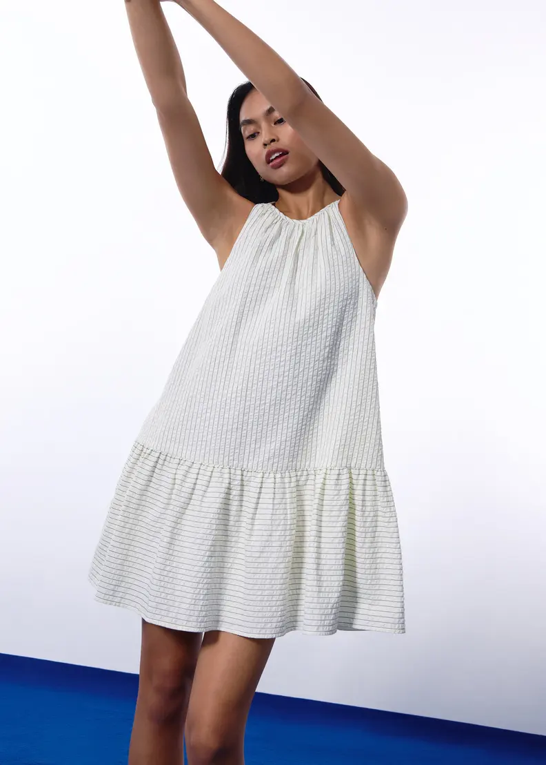 This mini trapeze dress is your fuss-free, throw-on-and-go answer to hot days and full calendars. Made from a pinstriped seersucker fabric, it features a halter neckline and an open back finished with a long, charming tie. The silhouette flares out gently from the neckline—bloat-friendly, bump-friendly, and ready to move with you. Fully lined and designed with functional side pockets because comfort shouldn’t mean compromise.