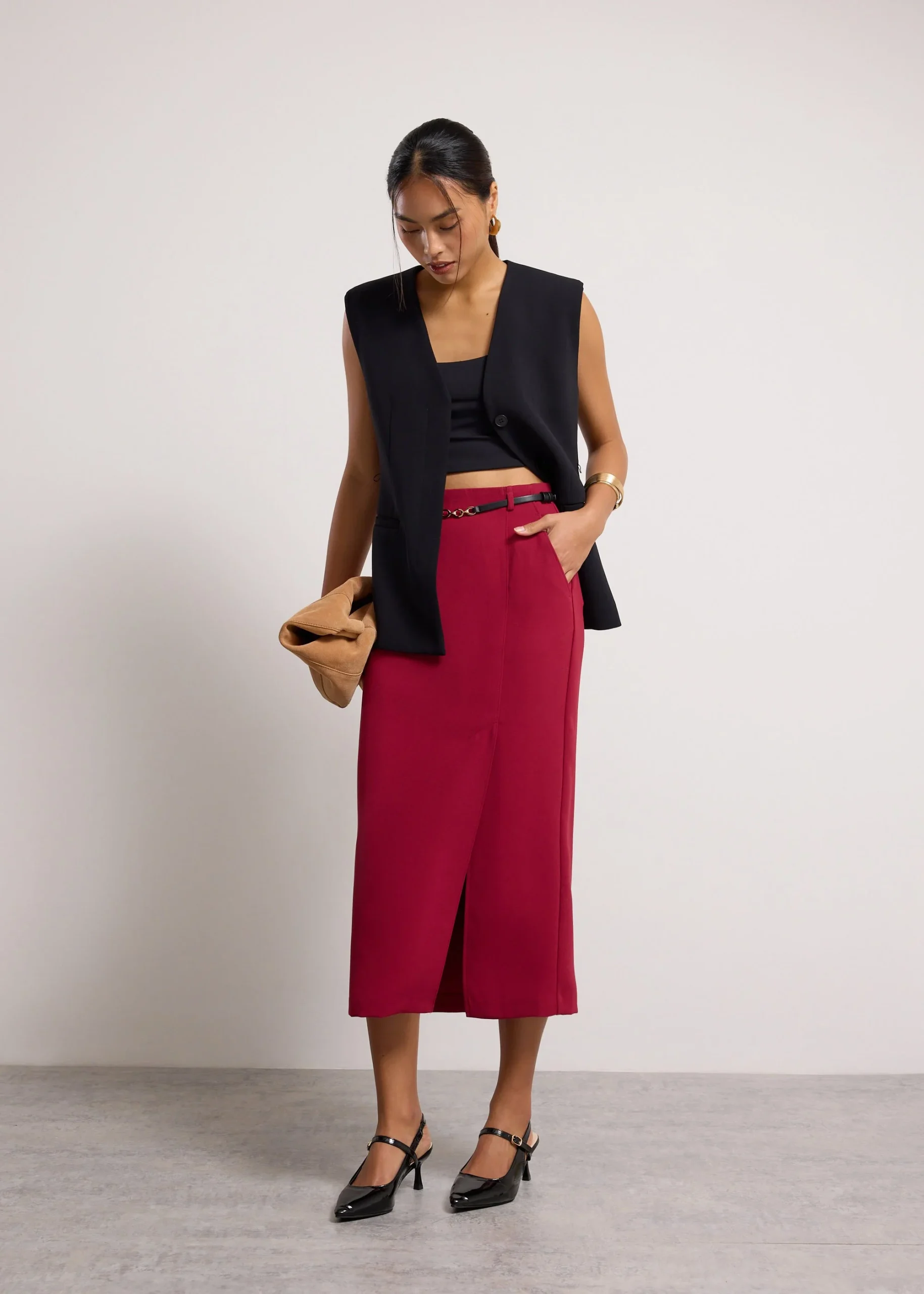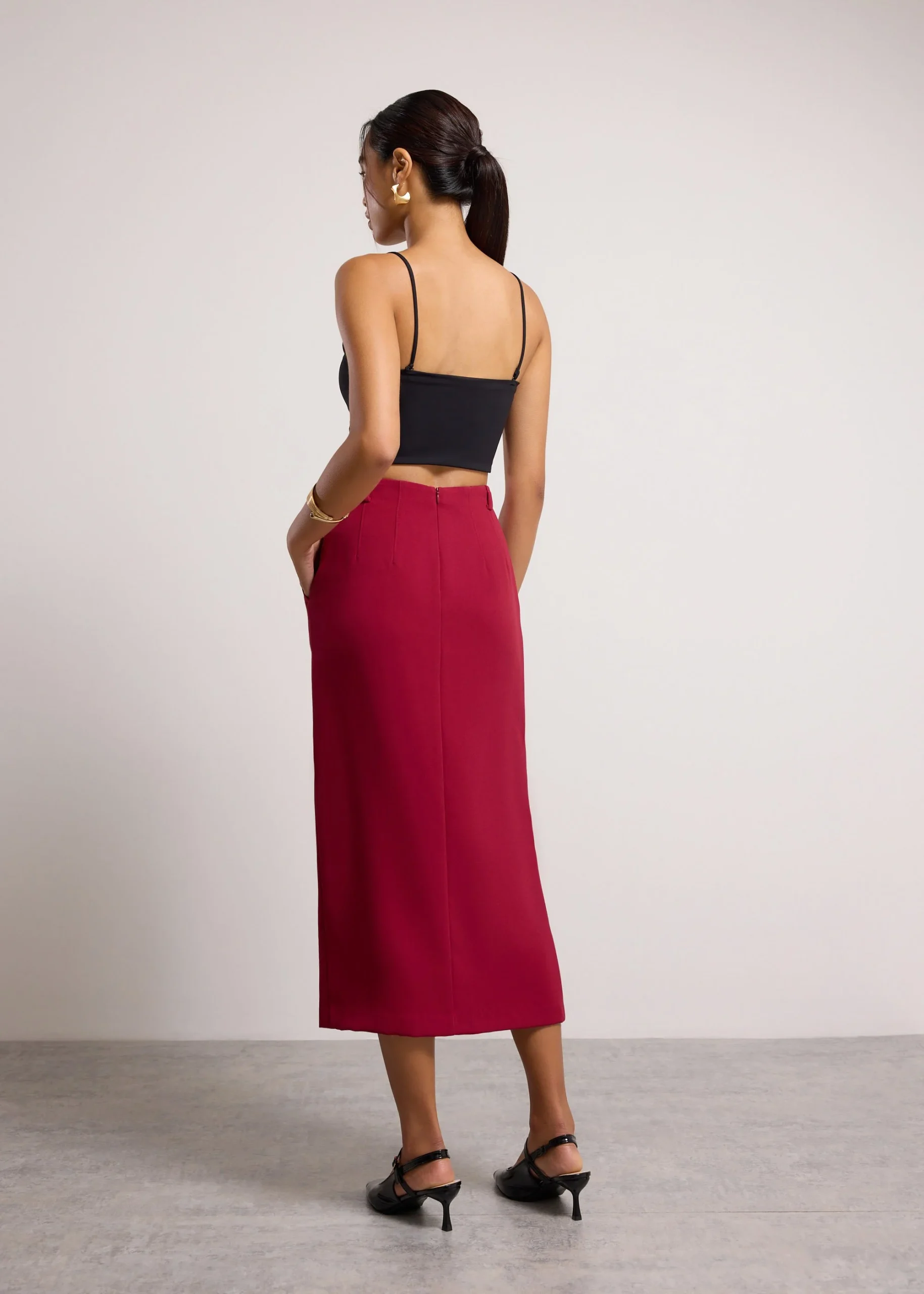 For the woman who looks put-together even when life gets chaotic. This midaxi skirt owns the classy office vibes with a tailored column silhouette and a side slit for flair. Crafted from crease-resistant crepe, you know she’ll stay crisp even on your busiest days. The elasticated back waist and concealed back zipper provide a flattering fit without the squeeze. Match her with a blouse and a blazer for the perfect power suit.