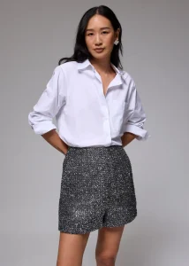 Glitter first, thoughts second. Shine like the star that you are in her metallic tweed fabric and A-line silhouette—just add a fancy top and your fave heels, and you’re ready to RSVP to any party this holiday season. Comes with side pockets and a back zip closure.
